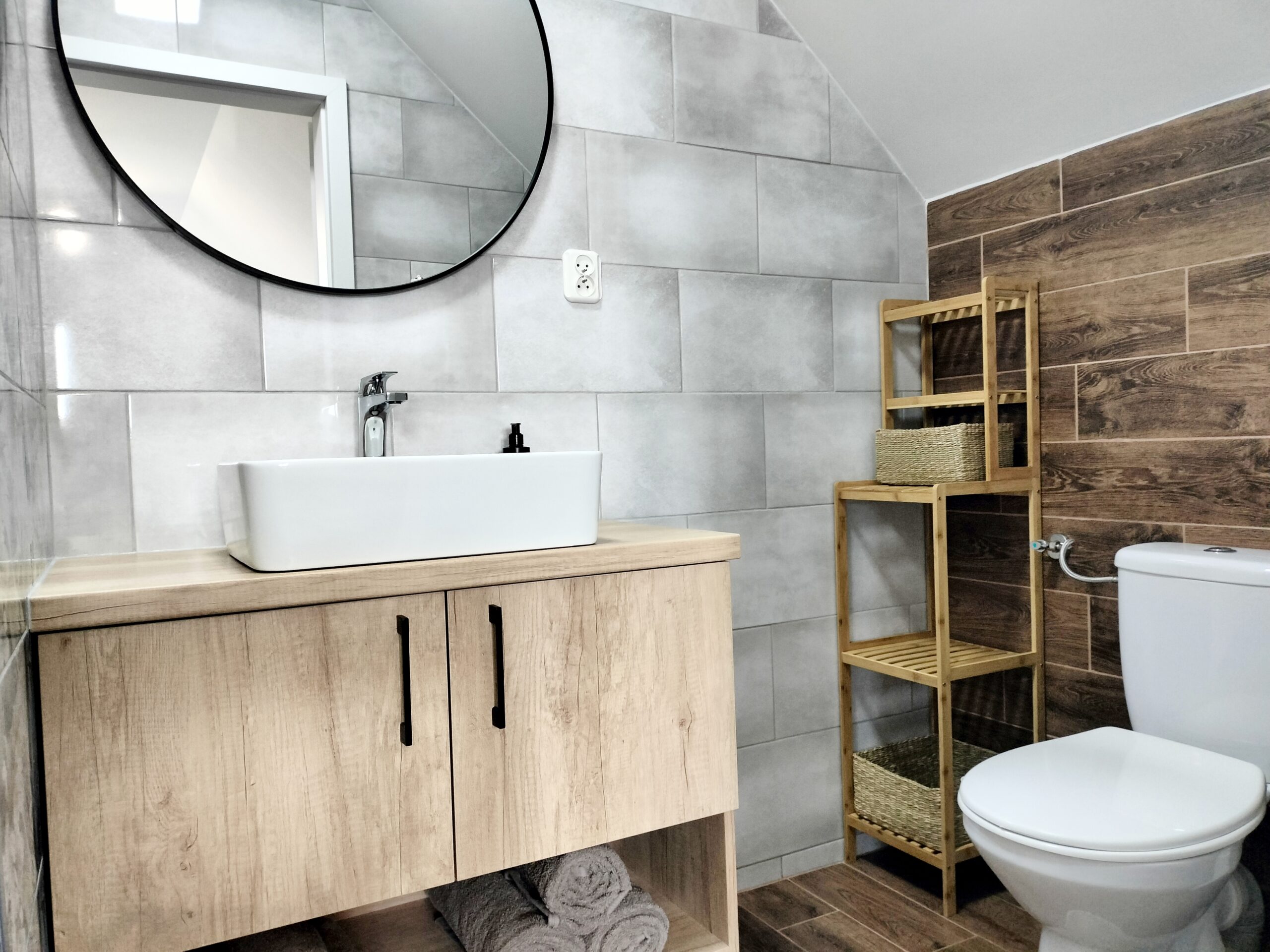 kieliszki, garnki, patelnie, przyprawy, kawę i herbaty. Łazienka wyposażona została w kabiny prysznicowe typu walk in, ręczniki oraz suszarkę do włosów.